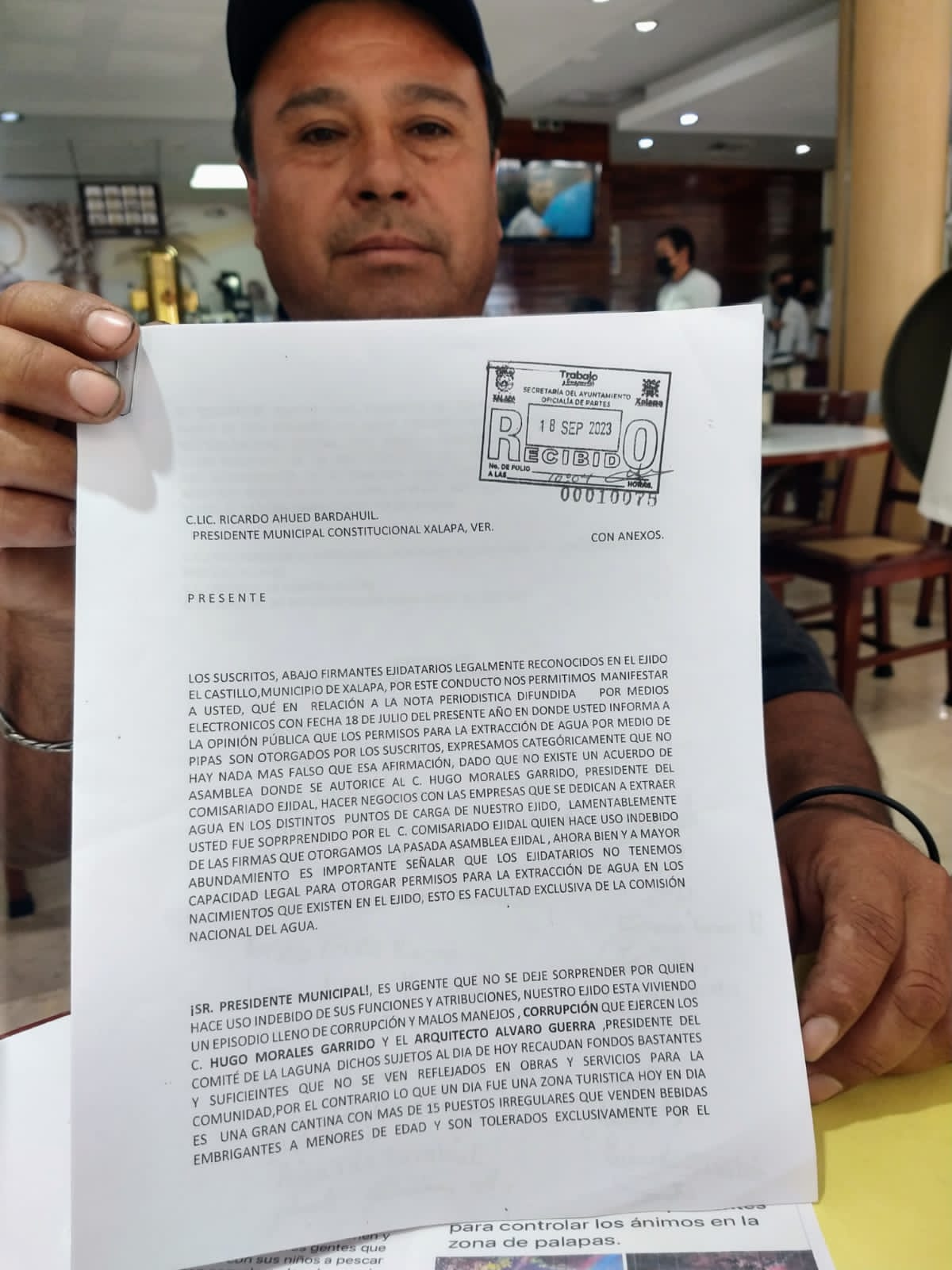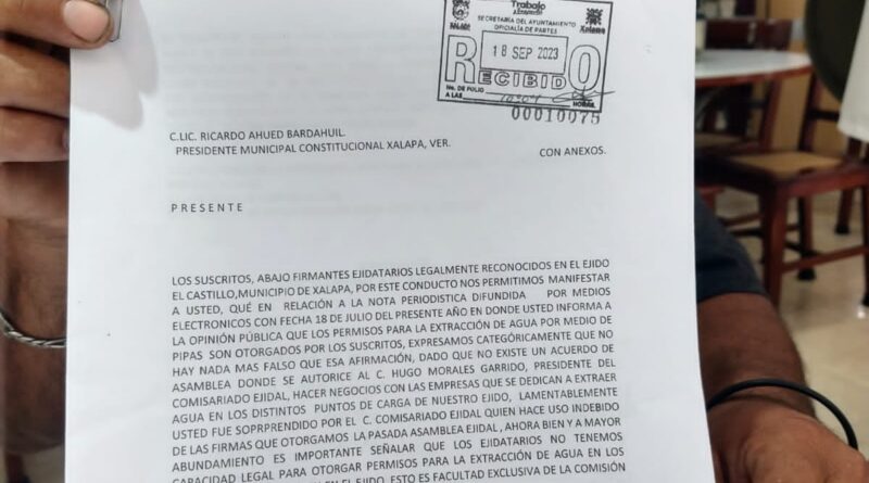 “El está ocupando nuestra firma para la venta del agua, la cual obtuvo en la última asamblea, en donde se acordó el otorgamiento de otros beneficios derivados del centésimo aniversario de la fundación del ejido y que ahora está haciendo algo indebido, usurpando una función para la cual no está facultado”, añadió.