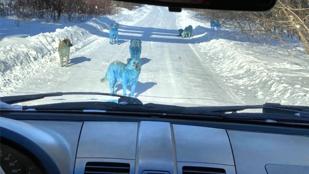 Una manada de caninos llamó la atención de los usuarios de internet en Rusia, después de que se publicara una foto en la que se aprecia a varios perros callejeros con pelaje azul brillante.