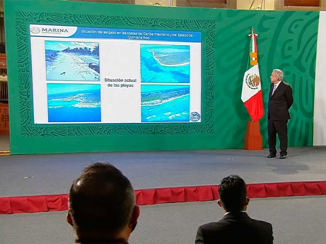 López Obrador aseguró que con la disminución de contagios y la limpieza de las playas pronto se reactivará el turismo; Semar destaca acciones para contener el arribo de esta alga