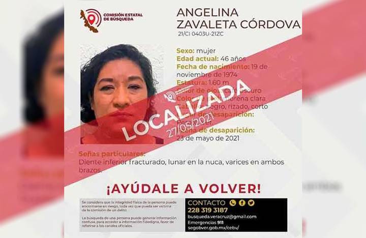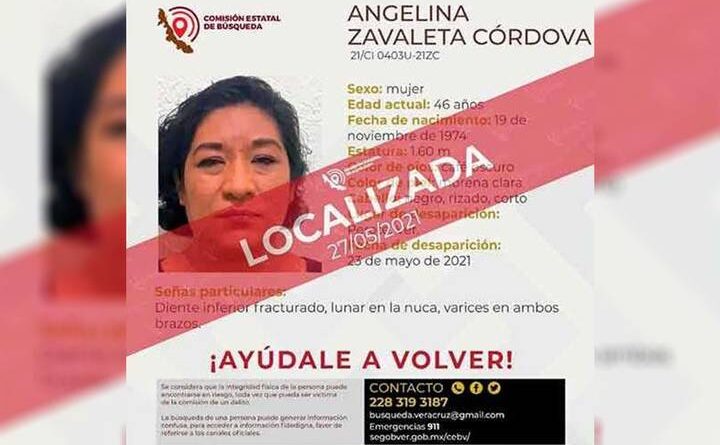 Tras varios días desaparecida fue localizada con vida la regidora V del ayuntamiento de Perote, Angelina Zavaleta Córdoba; desde el 23 de mayo su familia no sabía nada de su paradero.
