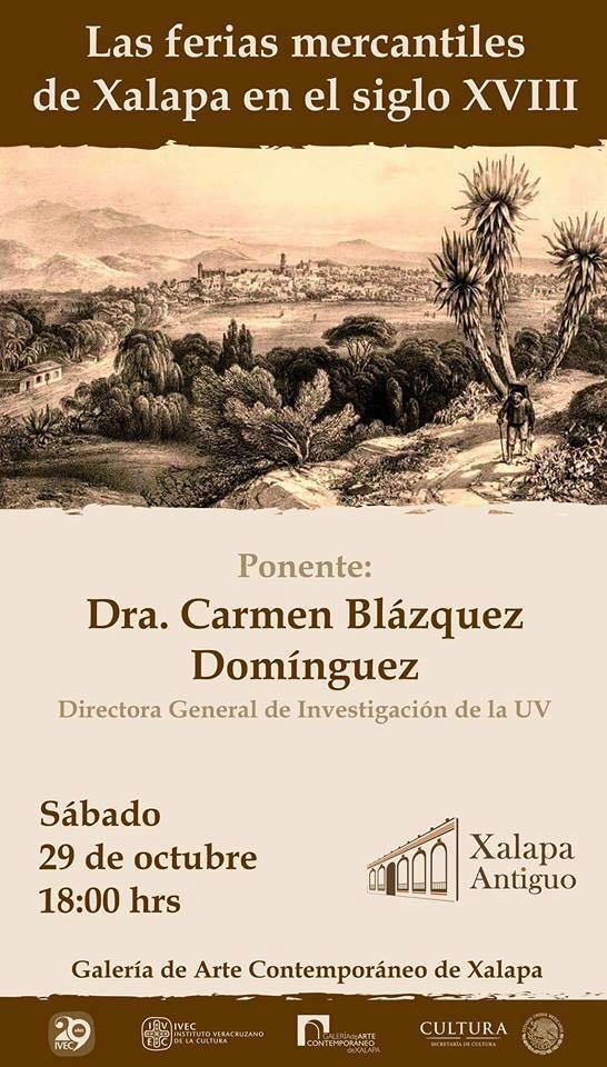 El Instituto Veracruzano de la Cultura y la Galería de Arte Contemporáneo de Xalapa, invitan al público en general a la ponencia “Las Ferias mercantiles de Xalapa en el siglo XVIII” a cargo de la Dra. Carmen Blázquez Domínguez, Directora General de Investigación de la UV como parte del programa “Sábados con Xalapa antiguo” que la GACX incluye en su programación mensual.