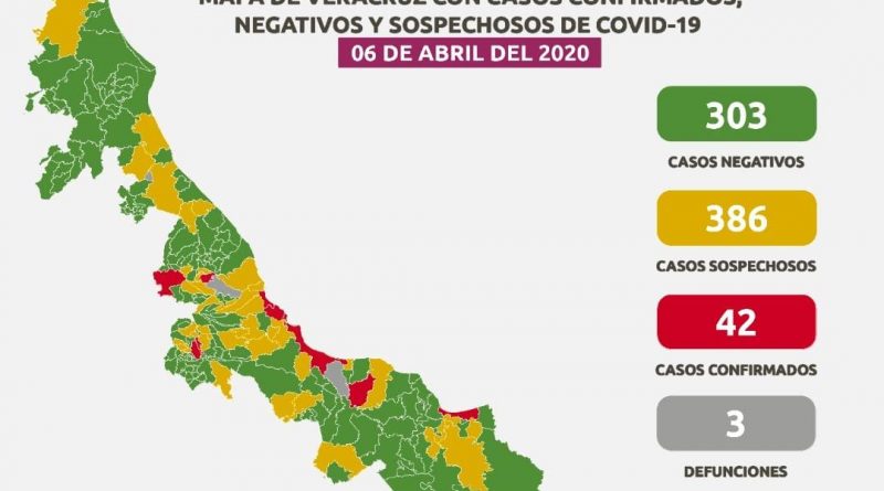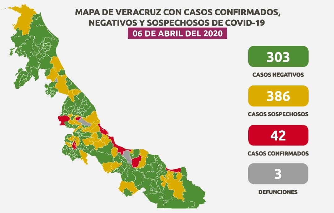 El número de positivos es de 42: 13 en Boca del Río, 12 en Veracruz, 4 en Poza Rica, 3 en Xalapa, 2 Tlacotalpan y uno en Perote, Ixtaczoquitlán, Fortín, La Antigua, Alvarado, Santiago Tuxtla, Coatzacoalcos y Emiliano Zapata (defunciones en Tlacotalpan, Emiliano Zapata y Poza Rica). Del total de positivos 24 están en recuperación tras 14 días de seguimiento y 15 casos más, en vigilancia.