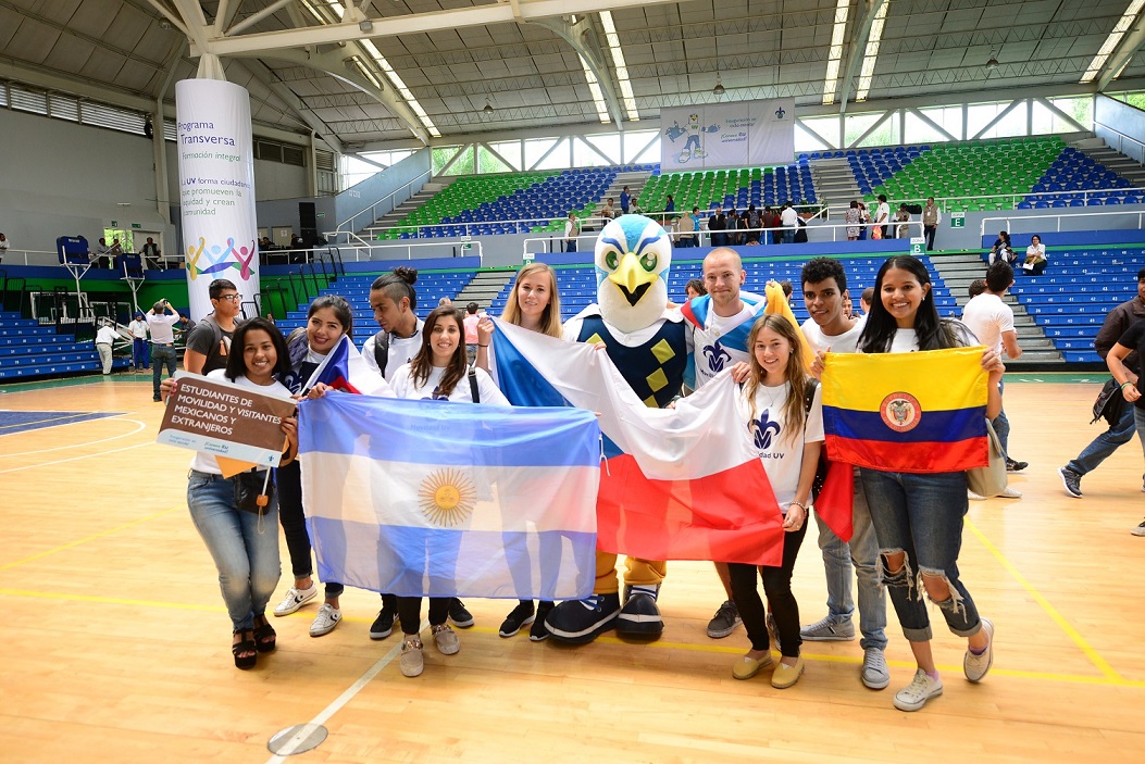 Los jóvenes participaron en la ceremonia de inauguración de cursos, que se llevó a cabo en el Gimnasio Universitario del Campus para la Cultura las Artes y el Deporte el viernes 5 de agosto, portando una playera blanca con la leyenda Movilidad UV y banderas de su país de origen.