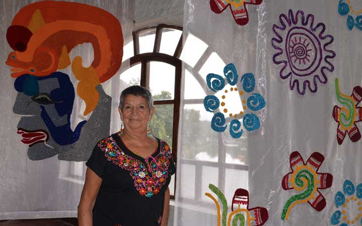 Por Karina de la Paz Reyes Díaz* La artista Luz Aldape expone desde el sábado 30 de septiembre Colores, texturas, textiles y formas de un mundo prehispánico, en la Casa del Lago de la Universidad Veracruzana (UV), exposición integrada por 17 textiles de gran formato bordados totalmente a mano con hilos de colores, cuya temática está centrada en la simbología de las culturas originarias del país, como flores, plantas, animales y deidades.