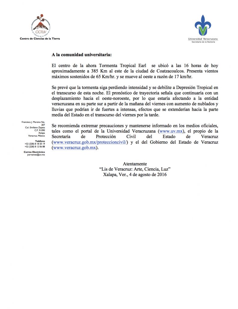 4 de agosto. UV comunica sobre la Tormenta Tropical Earl