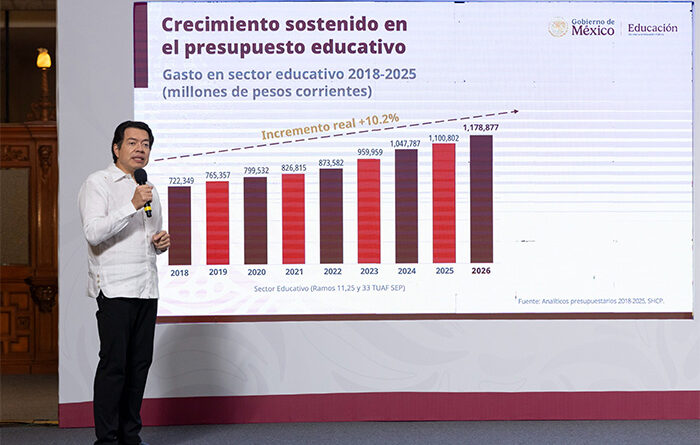 Explicó que actualmente existen 13.1 millones de becarios en el país y para el 2026 se estima alcanzar la cifra récord de 21.6 millones de becarios al extender la cobertura a los estudiantes de educación primaria, por lo que se contempló en el proyecto de presupuesto para el siguiente año de más de 50 mil 542 millones 321 mil 605 pesos, lo que representa un aumento de 64.1 % de aumento nominal y 58:8% en aumento real.