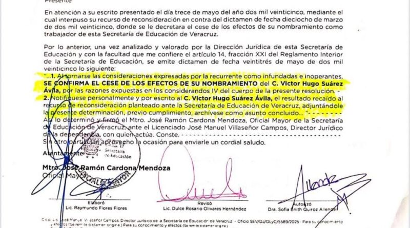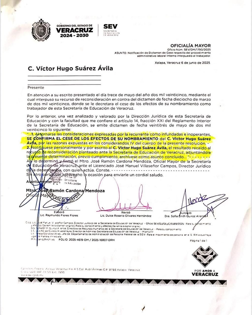 A través del oficio número: SEV/OM/1790/2025 de fecha 6 de junio del año en curso, signado por el maestro José Ramón Cardona Mendoza, en donde se le confirma “…el cese de los efectos de su nombramiento…”, y siendo notificado de manera formal el pasado lunes por parte de las autoridades educativas correspondientes.