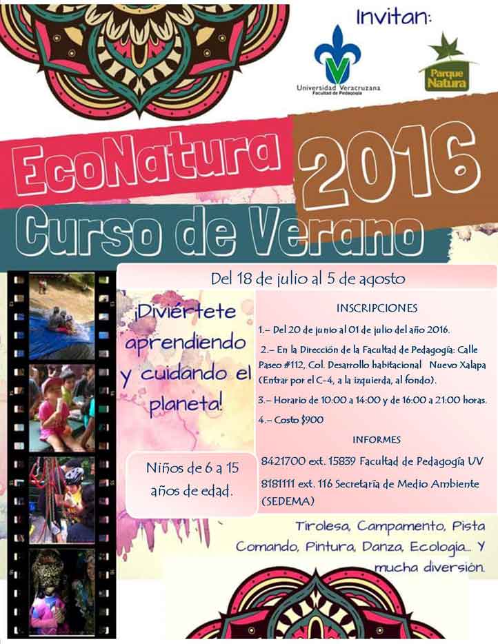 Xalapa, Ver. 21/06/2016.- La Facultad de Pedagogía de la Universidad Veracruzana (UV) y el Parque Natura invitan al curso de verano “EcoNatura 2016” que se desarrollará del 18 de julio al 5 de agosto, y cuya intención es que niños de seis a 15 años de edad se diviertan al tiempo que aprendan sobre el cuidado del planeta.