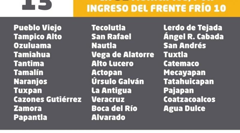 A fin de salvaguardar la integridad física de la población estudiantil y docente, las actividades se suspenderán en Pueblo Viejo, Tampico Alto, Ozuluama, Tamiahua, Tantima, Tamalín, Naranjos, Tuxpan, Cazones, Gutiérrez Zamora, Papantla, Tecolutla, San Rafael, Nautla, Vega de Alatorre, Alto Lucero, Actopan, Úrsulo Galván, La Antigua, Veracruz, Boca del Río, Alvarado, Lerdo de Tejada, Ángel R. Cabada, San Andrés Tuxtla, Catemaco, Mecayapan, Tatahuicapan, Pajapan, Coatzacoalcos y Agua Dulce.