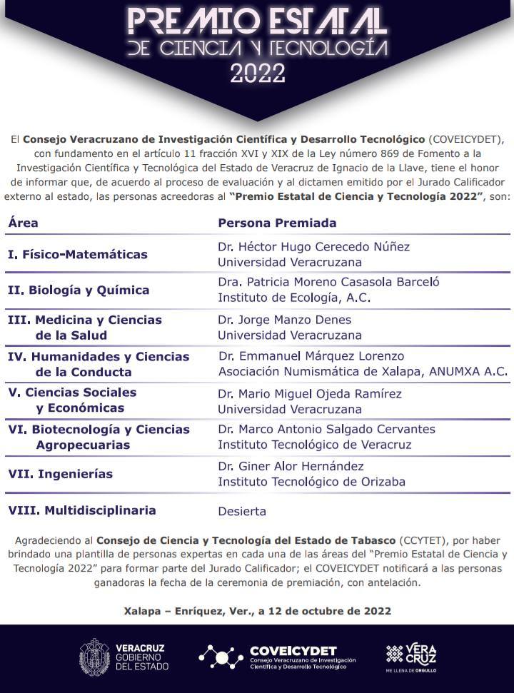 Banner Educación Ganan investigadores de la Universidad Veracruzana Premio Estatal de Ciencia y Tecnología 2022 14 octubre, 2022 Sin Recreo Viernes 14 de octubre de 2022.- Xalapa, Veracruz, México.- El COVEICYDET dio a conocer la relación de personas acreedoras al «Premio Estatal de Ciencia y Tecnología 2022″, entre los que destacan investigadores de la Universidad Veracruzana: