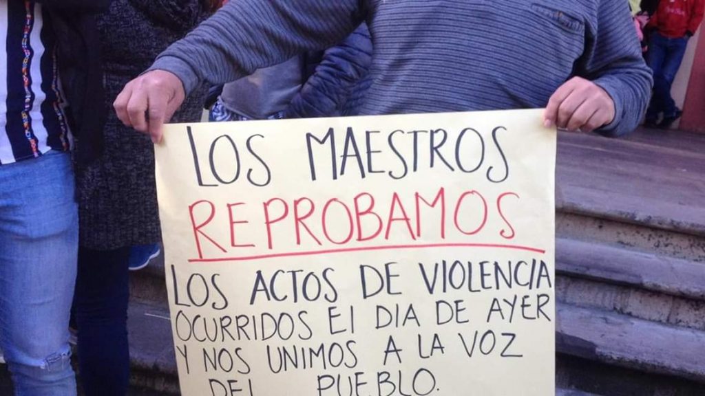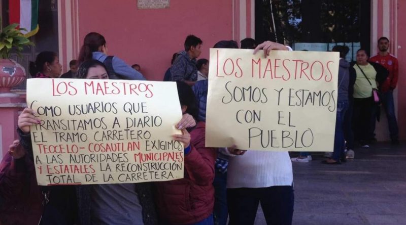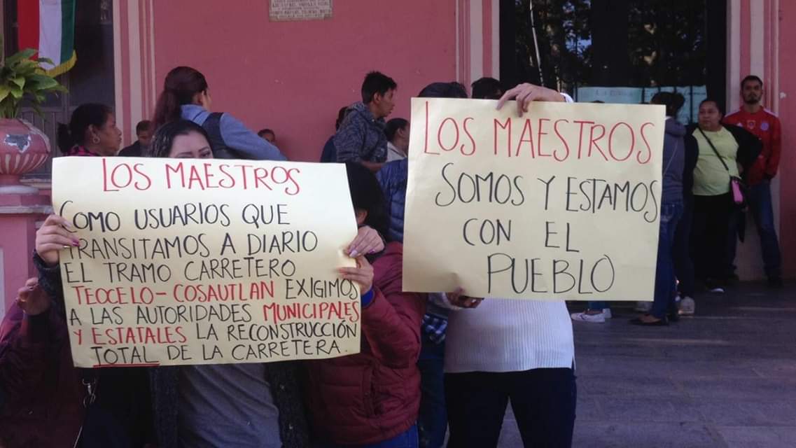 Se portan Pancartas la siguiente leyenda «MAESTROS REPROBAMOS LOS ACTOS DE VIOLENCIA OCURRIDOS EL DÍA DE AYER Y NOS UNIMOS A LA VOZ DEL PUEBLO» «LOS MAESTROS EXIGIMOS UNA CARRETERA DIGNA Y SEGURA» «COMO USUARIOS SE EXIGEN LA RECONSTRUCCIÓN TOTAL DE LA CARRETERA» .. vía Facebook Radio Teocelo