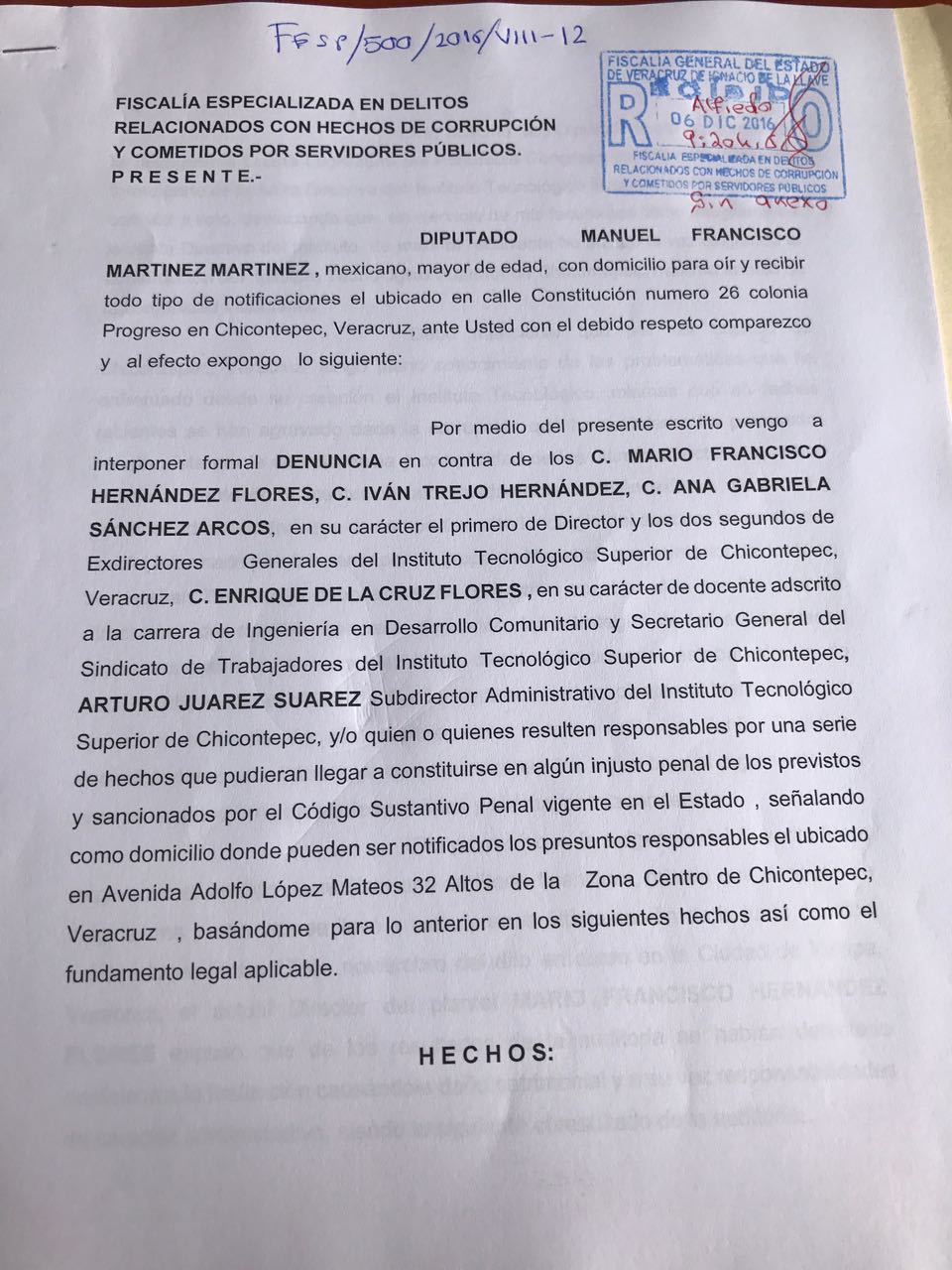 - El diputado local Manuel Francisco Martínez Martínez presentó la mañana de este martes una denuncia por presuntos desvíos de recursos por dos millones de pesos en el Instituto Tecnológico de Estudios Superiores de Chicontepec en contra de directivos y exdirectivos del mismo.