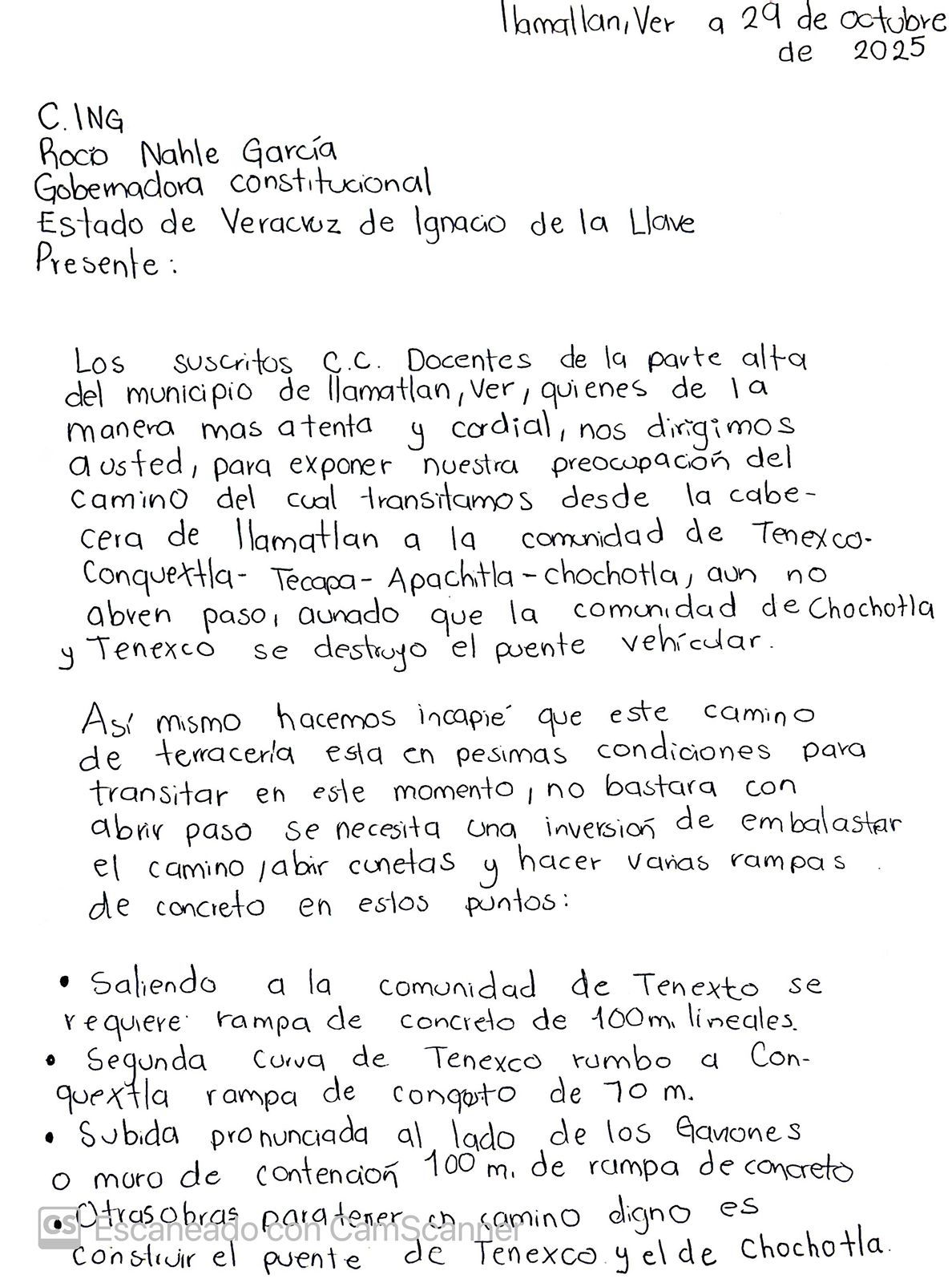 En un escrito, fechado el 29 de octubre, dirigido a la gobernadora Rocío Nahle García, las y los docentes expusieron que tan solo el camino, del cual transitamos, desde la cabecera municipal a la comunidad de Tenexco-Conquetla-Teapa-Apachitla-Chochotla, aún no abren el paso, lo que dificulta llegar hasta las localidades en dónde brindan el servicio educativo.