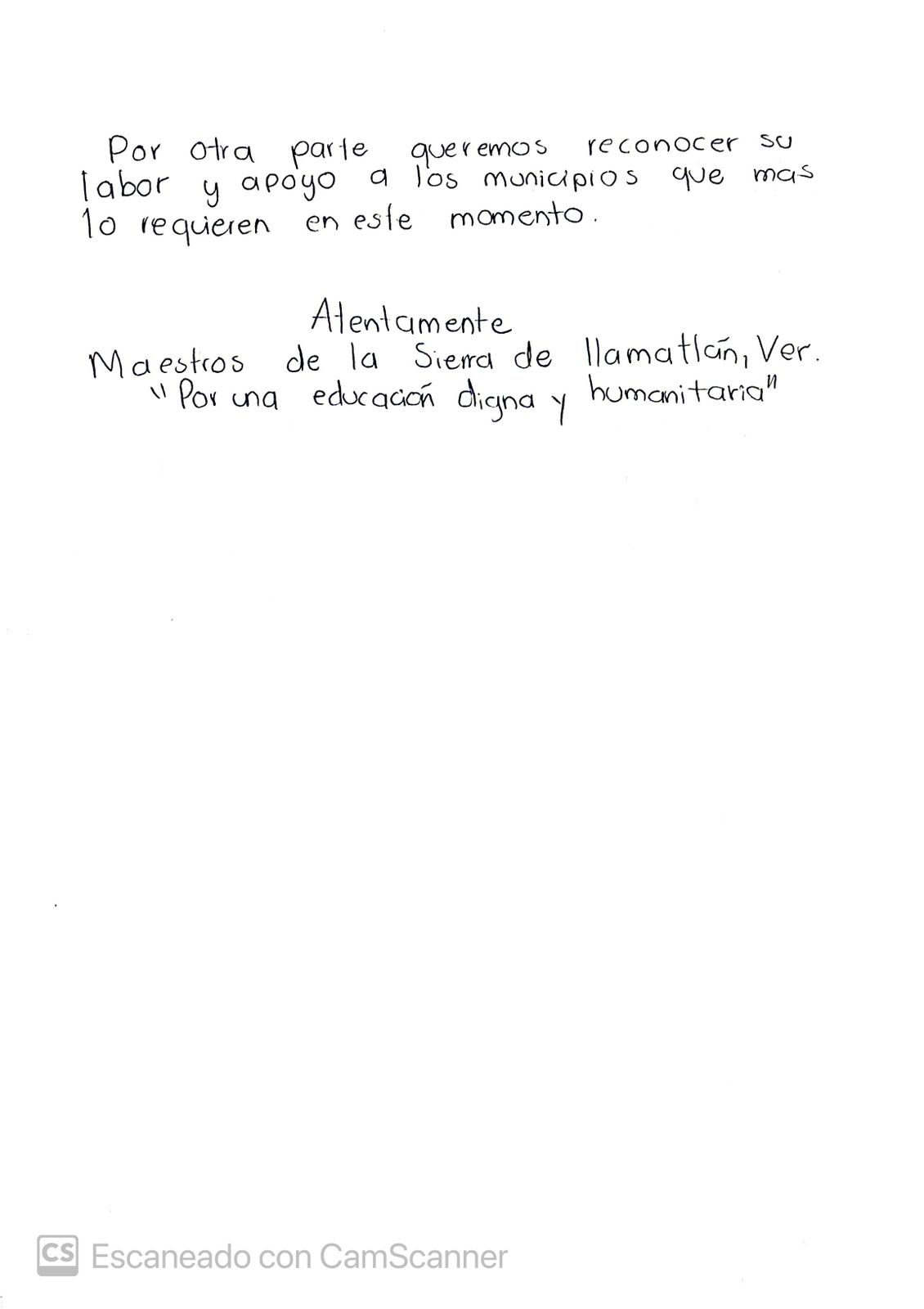 En el escrito, signado por unos 30 docentes, reconocieron la labor y el apoyo brindado por los gobiernos federal y estatal a los municipios que más lo requieran en este momento, pero sobre todo a la sociedad civil, quien sin buscar reflectores, coadyuvo en respaldar a las familias afectadas por el fenómeno natural, del que aun no han podido recuperarse en su totalidad.