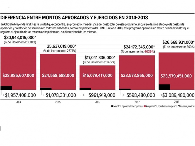 La Oficialía Mayor de la Secretaría de Educación Pública (SEP) ejerció en promedio, entre 2014 y 2018, una partida presupuestal de 23 mil millones de pesos; sin embargo, no se sabe de manera puntual en qué se gastó 95% de dichos recursos pues su uso fue discrecional, reveló la organización Mexicanos Primero.