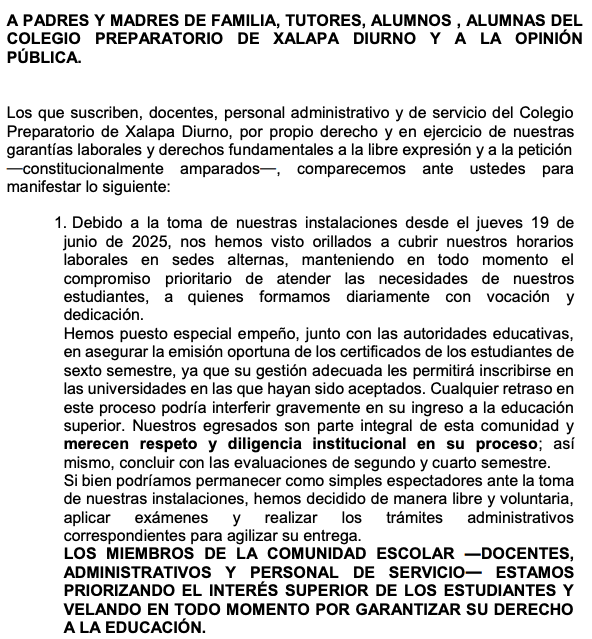Xalapa, Ver., a 25 de junio de 2025.- Personal docente, Personal administrativo y Personal de servicio a través de un comunicado a la Opinión pública, Padres y madres de familia, Tutores, Alumnos y Alumnas del Colegio Preparatorio de Xalapa (Diurno) “…por propio derecho y en ejercicio de nuestras garantías laborales y derechos fundamentales a la libre expresión y a la petición —constitucionalmente amparados—, comparecemos ante ustedes para manifestar lo siguiente:”