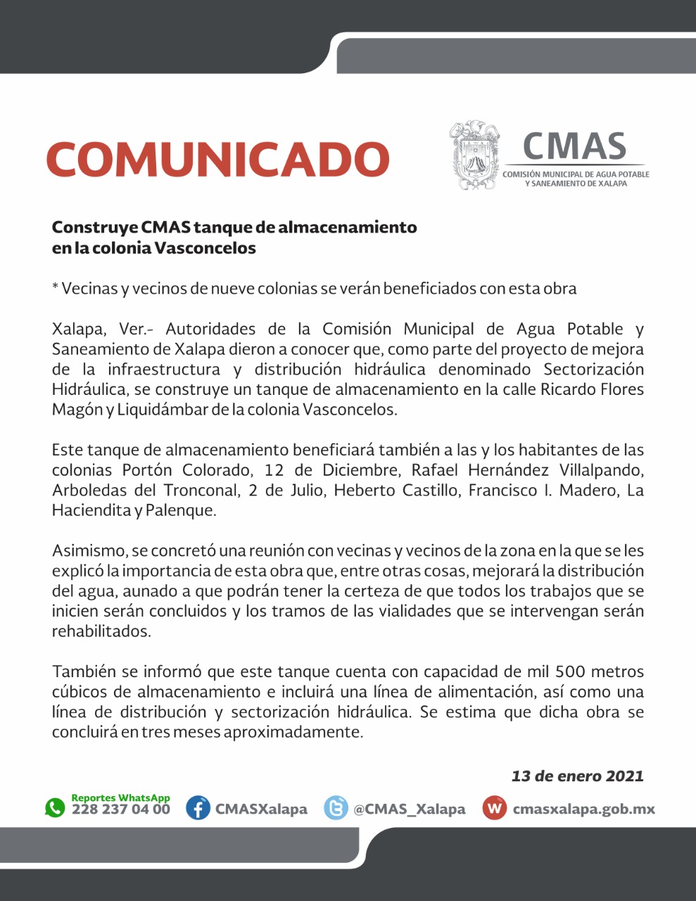 Autoridades de la Comisión Municipal de Agua Potable y Saneamiento de Xalapa dieron a conocer que, como parte del proyecto de mejora de la infraestructura y distribución hidráulica denominado Sectorización Hidráulica, se construye un tanque de almacenamiento en la calle Ricardo Flores Magón y Liquidámbar de la colonia Vasconcelos.