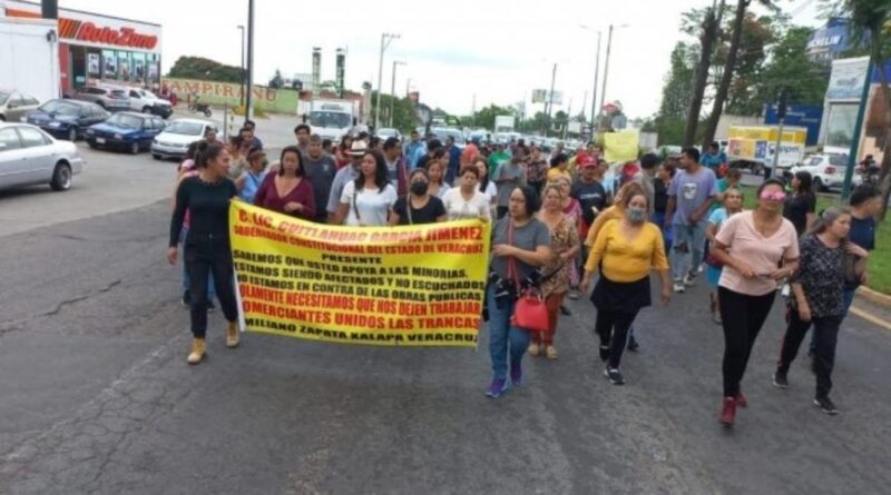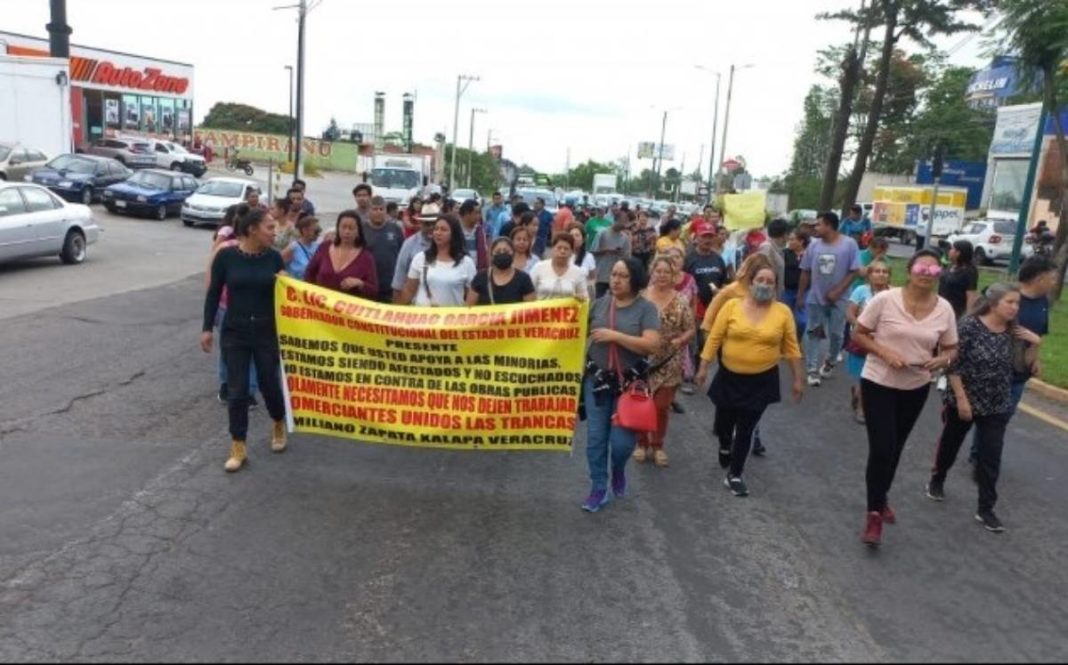 Comerciantes establecidos en Las Trancas de la ciudad de Xalapa realizaron una marcha y se manifestaron sobre la vía pública para denunciar que sus negocios están al borde de la quiebra económica debido a que las obras públicas de la carretera Veracruz-Xalapa disminuyeron la llegada de clientes.