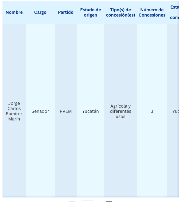 Jorge Carlos Ramírez Marín, senador del Partido Verde Ecologista de México (PVEM), es el político con el mayor volumen de agua concesionado a su nombre, pues posee tres títulos en Yucatán por un total de 1 millón 402 mil 11 metros cúbicos anuales. Uno fue registrado en 2003 y los restantes en 2014.