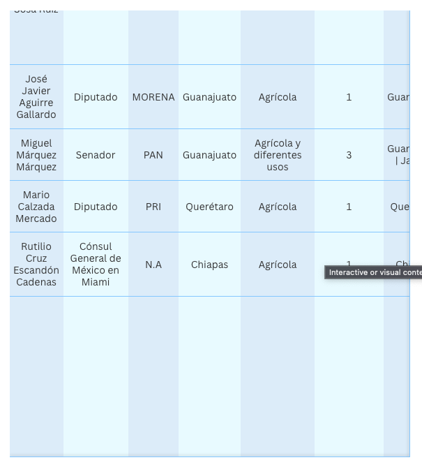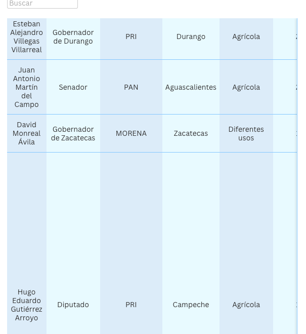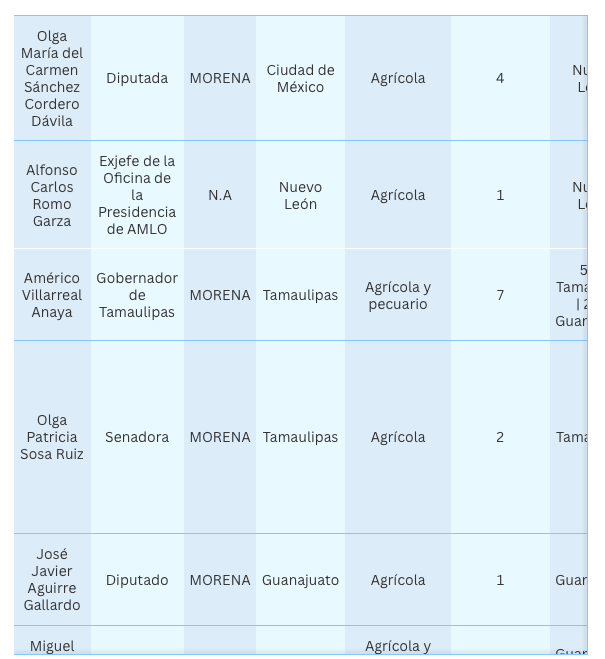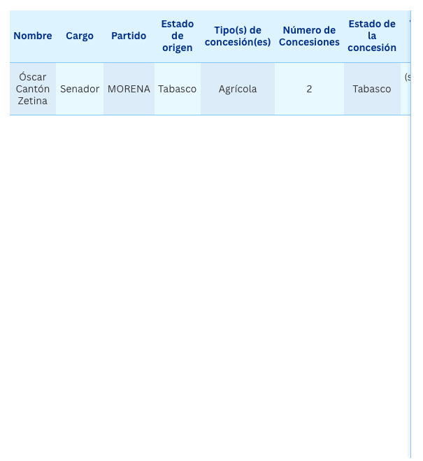 La senadora Olga Patricia Sosa Ruíz, de Morena, aparece en los registros de Conagua con dos concesiones por 640 mil metros cúbicos para uso agrícola. Sin embargo, aseguró a EL UNIVERSALque actualmente ya no cuenta con los títulos, pues la propiedad vinculada fue vendida en 2023. La legisladora votó a favor de las reformas en materia de agua.