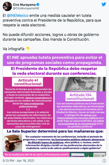 De este modo, Presidencia eliminó de todas sus plataformas digitales el video, acatando así la procedencia de la medida cautelar en la vertiente de tutela preventiva, emitida por el INE, ya que en la mañanera se difundió posible propaganda gubernamental «en periodo de campaña, en contravención a lo dispuesto en el Artículo 41 de la Constitución General, y de los criterios establecidos por la Sala Superior del Tribunal Electoral del Poder Judicial de la Federación”, como argumentó el INE el lunes.