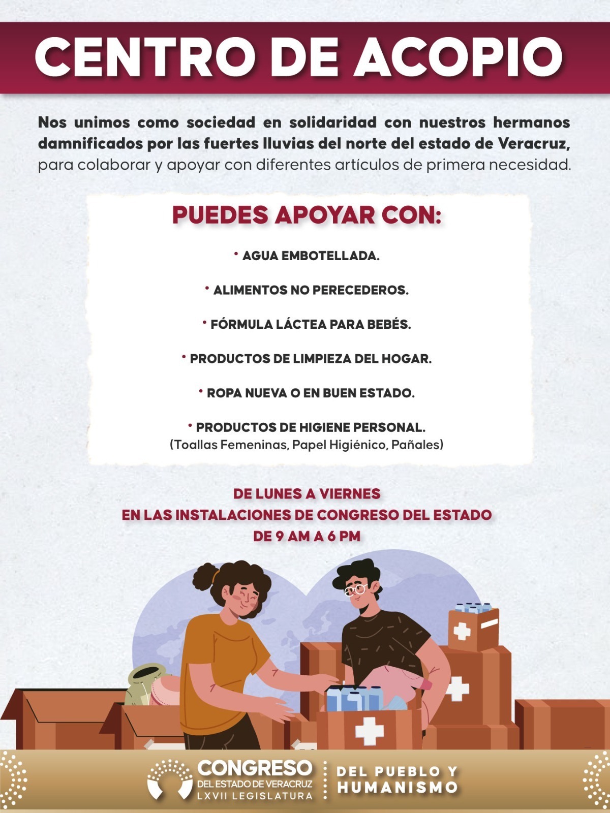 #ATENCION El Centro de Acopio permanece instalado de 09:00 a 18:00 horas, en el interior del Palacio Legislativo, ubicado entre las avenidas Encanto y Lázaro Cárdenas, en esta ciudad de Xalapa, Veracruz.