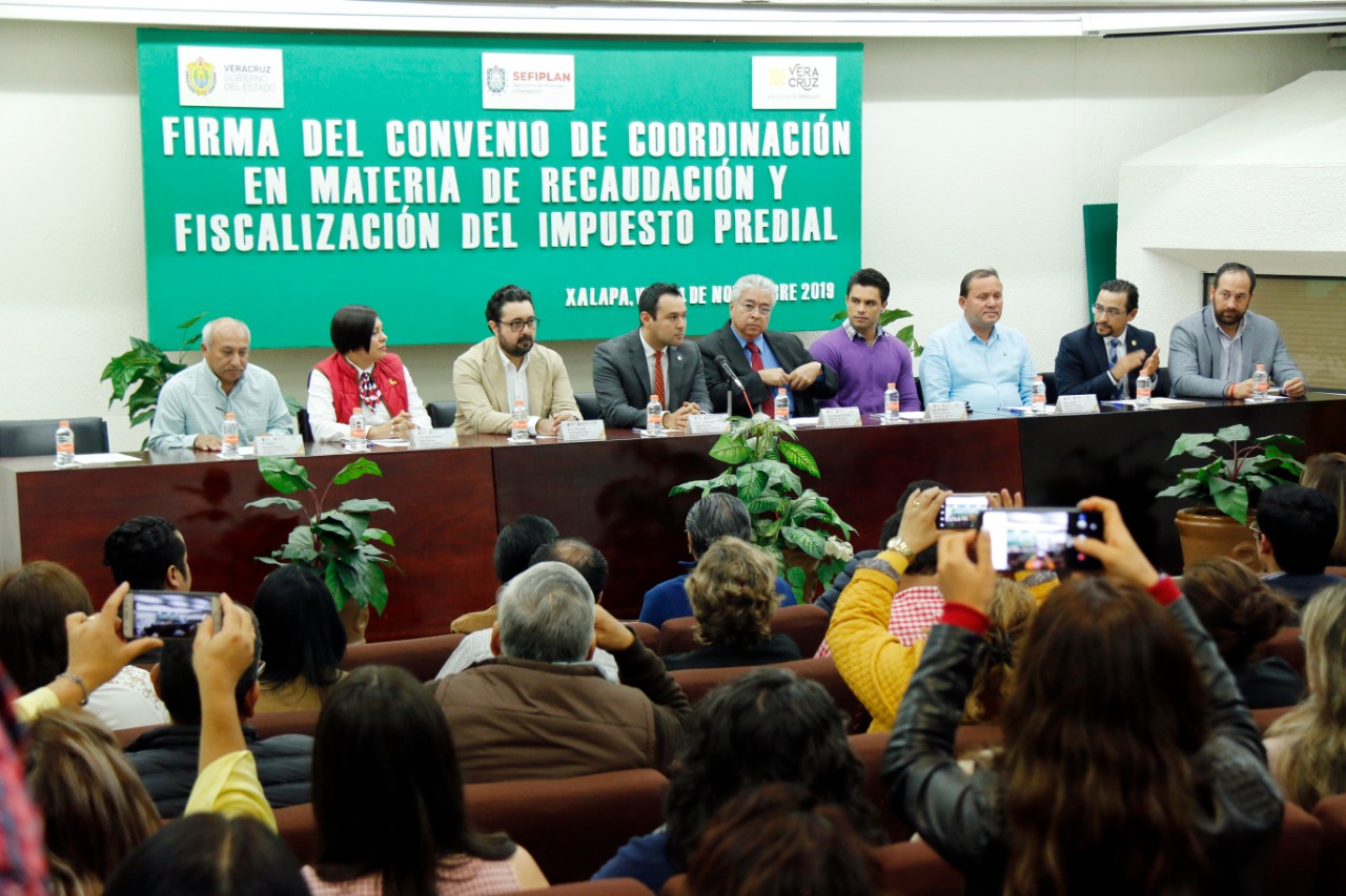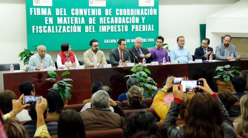 Xalapa, Ver., 15 de noviembre de 2019.- La Secretaría de Finanzas y Planeación (SEFIPLAN), junto con la Secretaría de Gobierno (SEGOB) y ocho municipios veracruzanos, signaron el “Convenio de coordinación y colaboración administrativa en materia de recaudación y fiscalización del impuesto predial y sus accesorios legales”, con la finalidad de fortalecer el erario municipal.