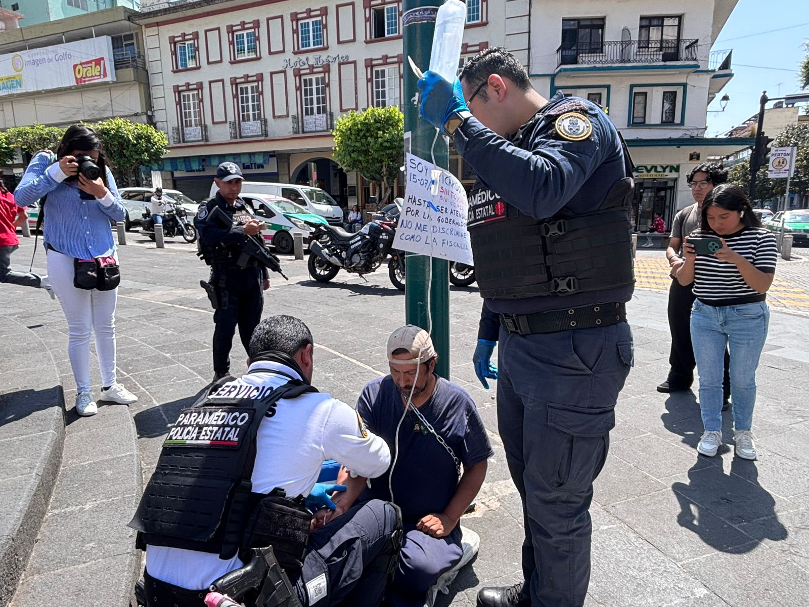 Irineo Pérez Melo.- A 39 días de estar en huelga de hambre y por segundo día consecutivo encadenado a un poste del alumbrado público, a un costado de la Plaza Sebastián Lerdo de Tejada, Juan Ricardo Ordóñez Jerez resiente los estragos del ayuno prolongado, por lo que fue necesaria la intervención de los paramédicos de la Secretaría de Seguridad Pública quienes le suministraron suero para rehidratarlo.