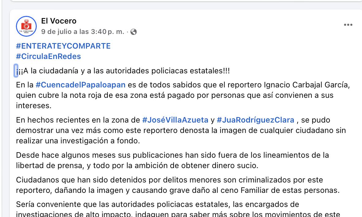 Como adelanté en días pasados, este día interpuse formal denuncia en la Fiscalía General del Estado (77/2025/PC), por las publicaciones que han realizado, personas con intereses oscuros, y que protegen a integrantes de la delincuencia organizada que operan en Sayula de Alemán, José Azueta, Isla y Juan Rodríguez Clara, a raíz de una serie de publicaciones en las páginas de Facebook, “El Vocero” y “Zona Roja”, páginas que fueron creadas para desacreditarme a mí y a mis amistades únicamente por alzar la voz ante tanto abuso que se comete en esos municipios, abusos que hemos documentado, expuesto y dado a conocer de manera puntual como parte de mi labor periodística, lo que tiene muy molestos a políticos locales y a delincuentes.
