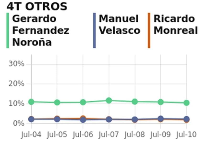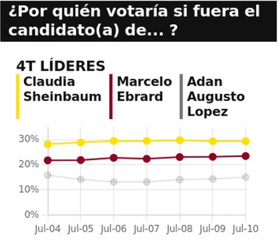 - Claudia Sheinbaum con 29.4% (igual que ayer), Marcelo Ebrard con 23.5% (tres décimas más que ayer); Adán Augusto López con 15.1% (siete décimas más que ayer); Gerardo Fernández Noroña con 10.6% (cuatro décimas menos de ayer); Manuel Velasco con 2.4% (dos décimas menos que ayer) y Ricardo Monreal con 2% (tres décimas menos que ayer).