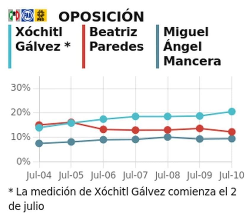 - Xóchitl Gálvez con 20.6% (un punto y ocho décimas más que ayer); Beatriz Paredes, senadora, con un 12.3% (un punto y cuatro décimas menos que ayer); y Miguel Ángel Mancera con 9.5% (una décima más que ayer).