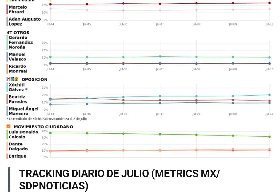 Este martes 11 de julio, SDPnoticias y MetricsMx presentan los resultados del tracking diario al respecto de los posibles candidatos a la presidencia para las elecciones 2024 de las distintas fuerzas políticas.
