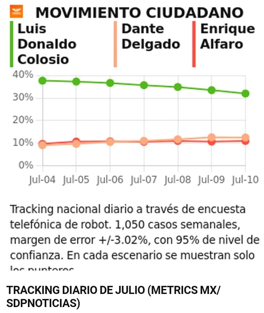 - Luis Donaldo Colosio con 32% (un punto y cinco décimas menos que ayer), Enrique Alfaro gobernador de Jalisco con 11% (tres décimas más que ayer) y Dante Delgado con 12.5% (una décima menos que ayer)