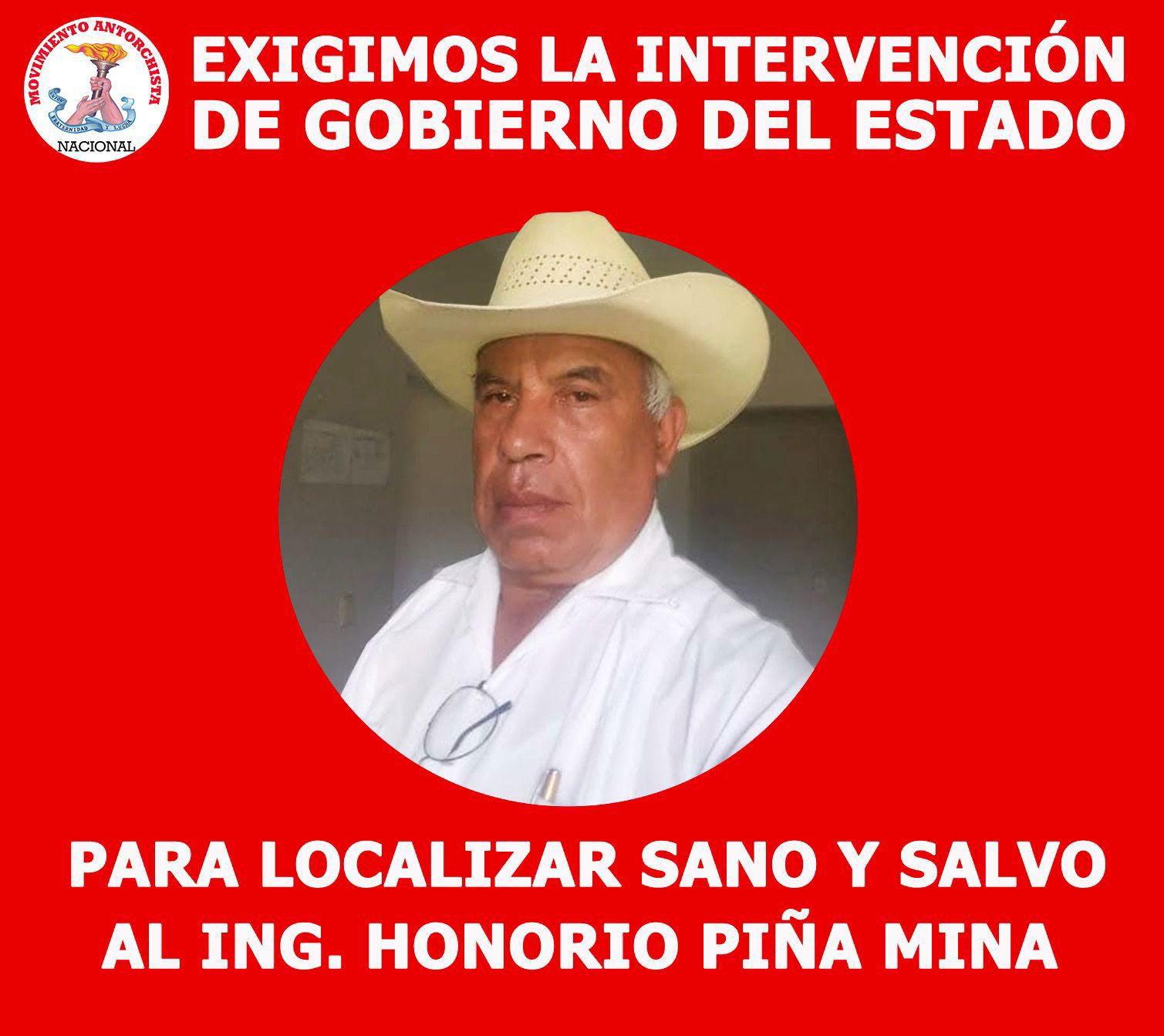Irineo Pérez Melo.- El Movimiento Nacional Antorchista en el estado de Veracruz exigió la intervención del gobierno de Veracruz para dar con el paradero del ingeniero Honorio Piña Mina, integrante del comité directivo estatal de esta organización, quien desapareció este miércoles alrededor de las 14:00 horas.