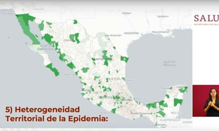 “La enorme mayoría del territorio nacional tenemos municipios sin casos, es lo que se ve en forma de color blanco; en cambio, tenemos algunas zonas donde el color verde muestra la intensidad de transmisión con el número de casos que se registran -como hemos explicado y lo seguiremos explicando los jueves- y los casos que se pueden estimar con la vigilancia Centinela”, Hugo López-Gatell, subsecretario de Salud.