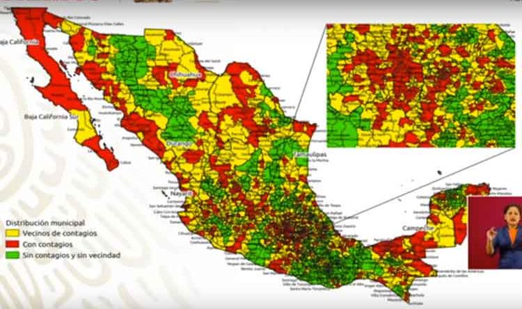 Para poder definir cuales serán los municipios que regresen a actividades a mediados de mayo, el subsecretario de Salud, presentó un mapa en color rojo, amarillo y verde que muestra los lugares sin contagios (verde), con contagios (rojo) y con vecinos de contagio (amarillo).