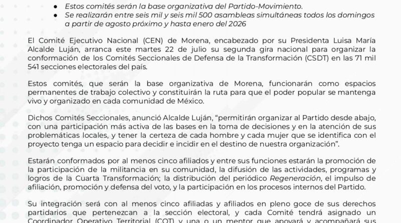 El Comité Ejecutivo Nacional (CEN) de Morena, encabezado por su Presidenta Luisa María Alcalde Luján, arranca este martes 22 de julio su segunda gira nacional para organizar la conformación de los Comités Seccionales de Defensa de la Transformación (CSDT) en las 71 mil 541 secciones electorales del país.