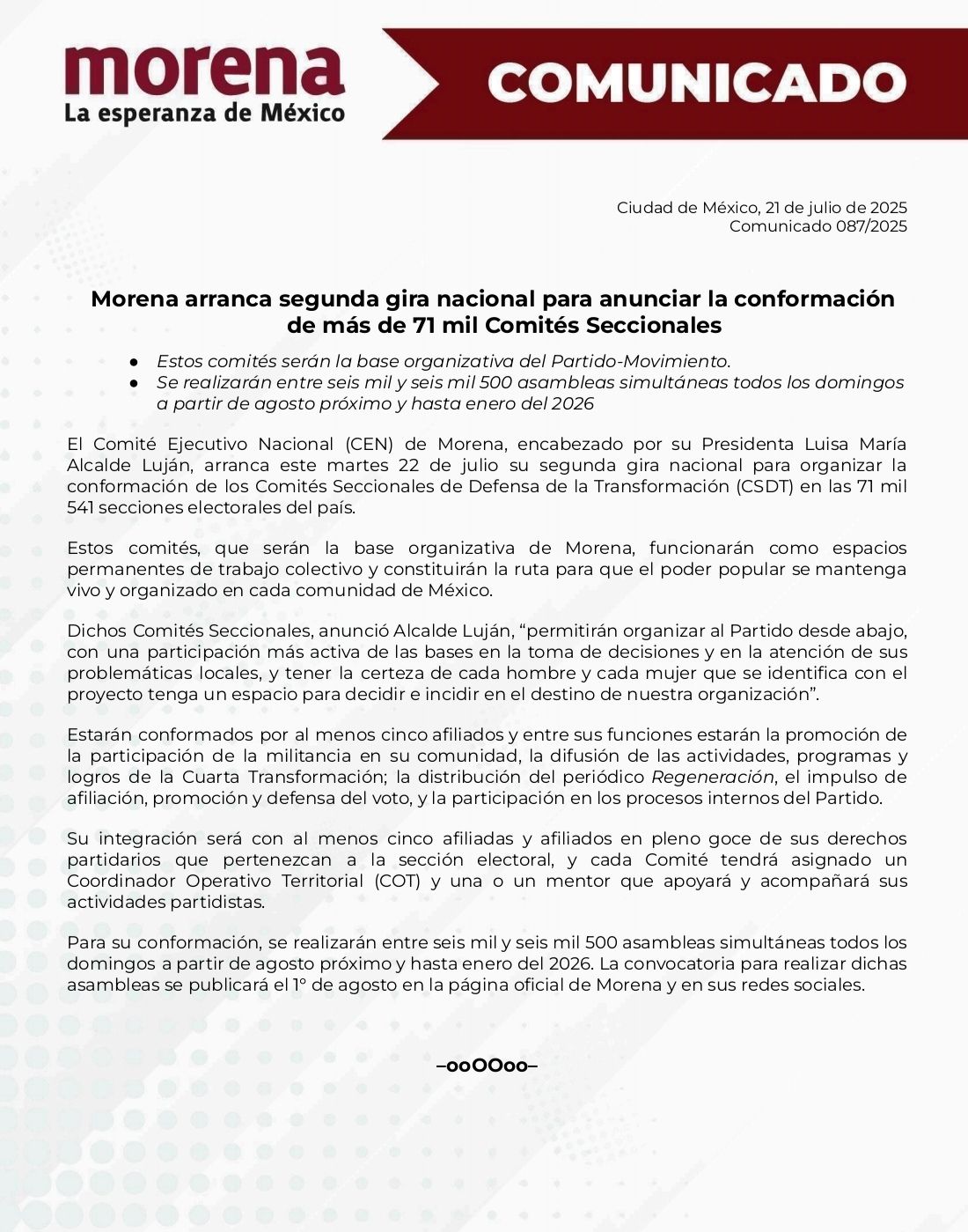 Para su conformación, se realizarán entre seis mil y seis mil 500 asambleas simultáneas todos los domingos a partir de agosto próximo y hasta enero del 2026. La convocatoria para realizar dichas asambleas se publicará el 1° de agosto en la página oficial de Morena y en sus redes sociales.
