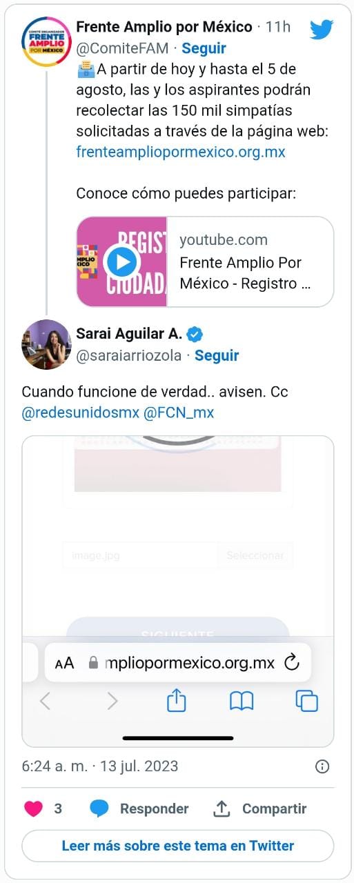 Algunos usuarios han reportado que después de que logran entran a esta plataforma digital, al querer registrar su apoyo, la pagina se “pasma” o “no funciona”. Por ello, los 13 aspirantes a representante del Frente Amplio por México, que de ganar se convierte en candidato presidencial, tendrían menos de 24 días para juntar las 150 mil firmas que necesitan para pasar a la tercera fase del proceso.