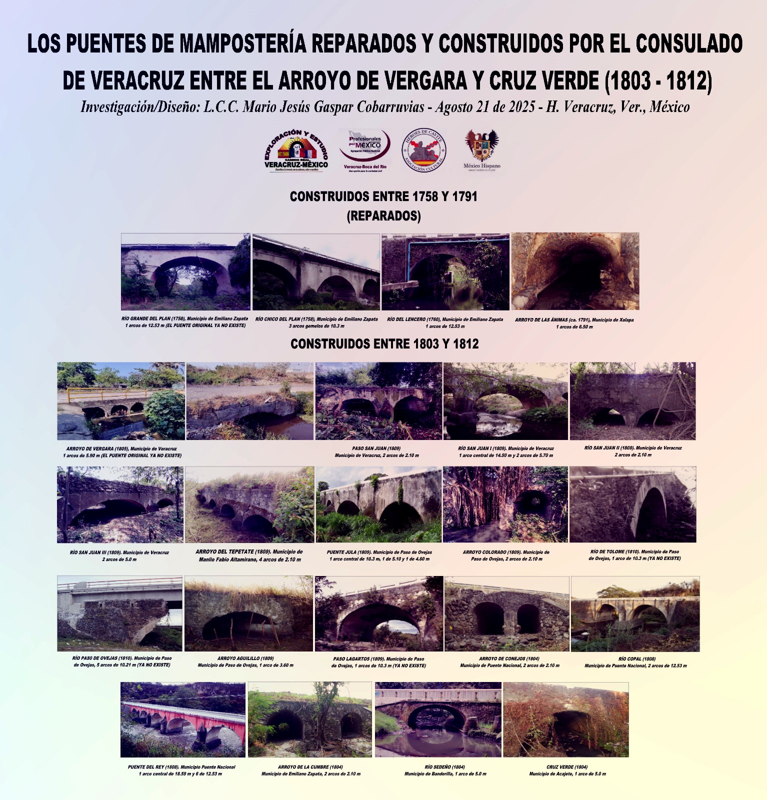 Con gran gusto, les compartimos esta publicación especial que compila los puentes de mampostería de piedra que el ilustre Consulado de comerciantes de la ciudad de Veracruz y la villa de Xalapa, construyeron entre el 18 de abril de 1803 y el 20 de mayo de 1812 para su camino real Nuevo de Veracruz a Perote, que permitiría el tráfico de carretas, recuas de mulas y piezas de artillería en cualquier época de lluvia. Así como 4 puentes que ya existían desde 1758 y fueron reparados para alargar su periodo de vida útil.