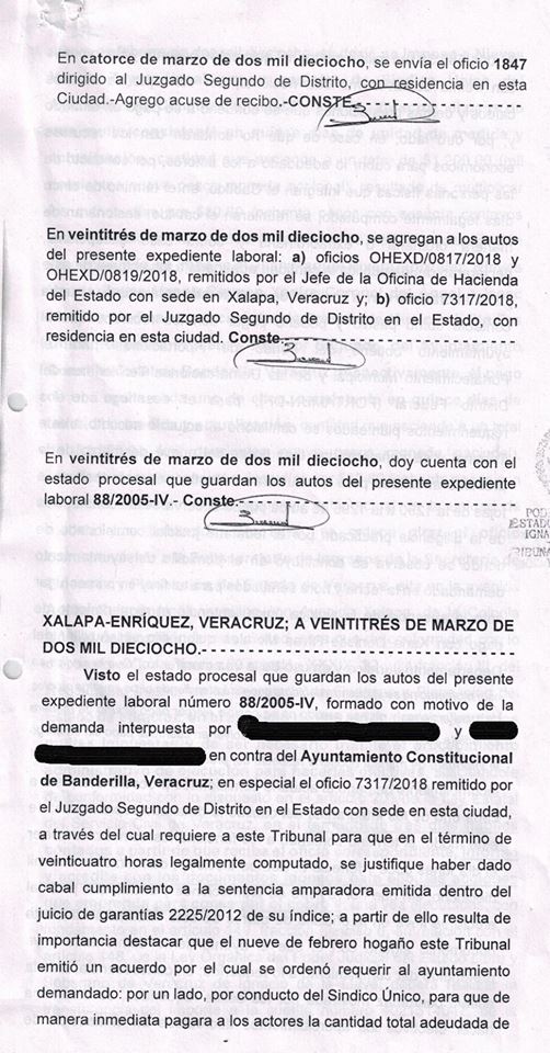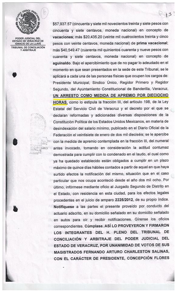 Dos trabajadores despedidos injustificadamente del Ayuntamiento de Banderilla, Veracruz en el año 2005, demandaron y obtuvieron un laudo favorable a sus intereses. Desde el 2008 la citada entidad pública estaba obligada a dar cumplimiento total al laudo sin que, hasta el momento, haya acatado la decisión de la autoridad judicial, no obstante que se le ha requerido en múltiples ocasiones, y a pesar de que el Poder Judicial Federal (a través del Juez Segundo de Distrito en el Estado), ha ordenado también el cumplimiento del fallo laboral.