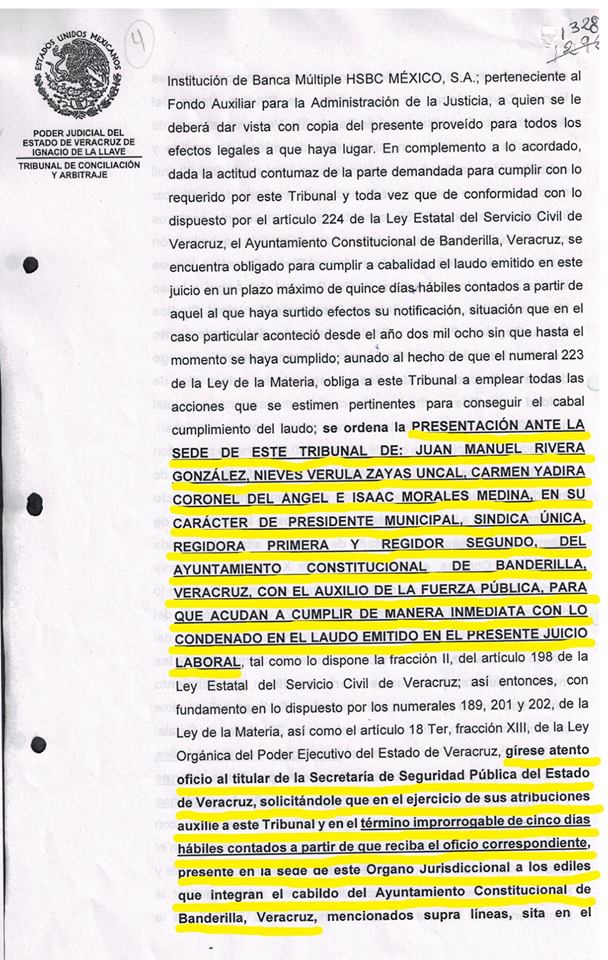 En el auto referido, el Tribunal burocrático dispuso girar oficio al Secretario de Seguridad Pública del Estado para que presente ante esa instancia judicial a los ediles Juan Manuel Rivera González, Nieves Vérula Zayas Uncal, Carmen Yadira Coronel Del Ángel e Isaac Morales Medina; lo anterior “bajo el apercibimiento que de no pagar lo adeudado en el momento en que sean presentados en la sede de este Tribunal, se le aplicará a cada una de las personas físicas que ocupen los cargos de Presidente Municipal, Síndico Único, Regidor Primero y Regidor Segundo, del Ayuntamiento Constitucional de Banderilla, Veracruz, un arresto como medida de apremio por dieciocho horas…”