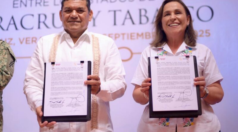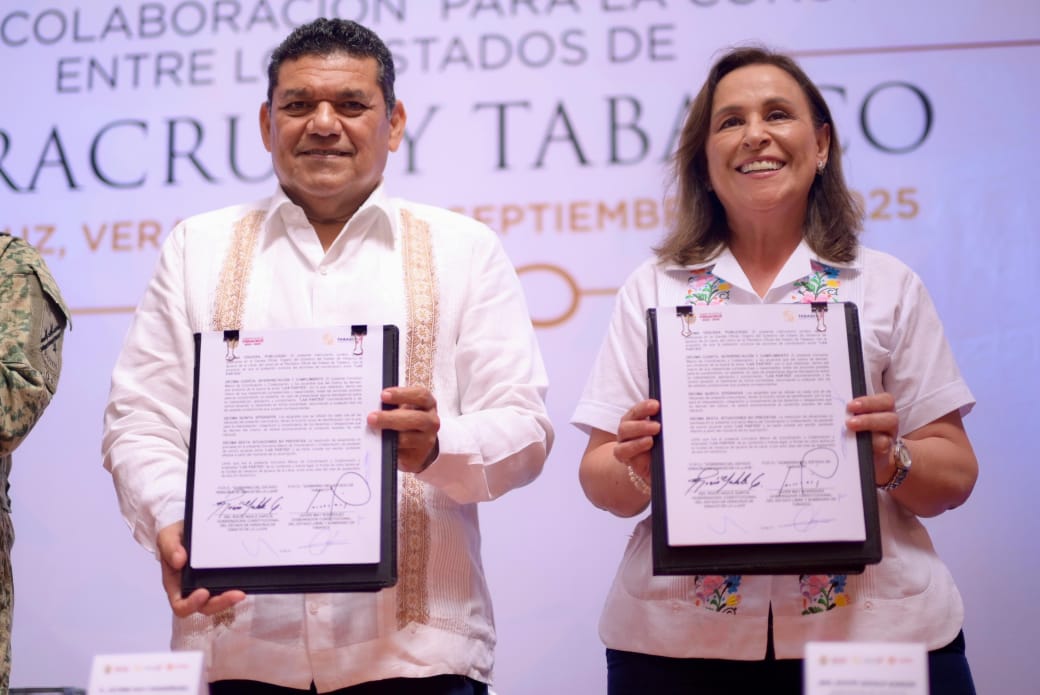 Veracruz, Ver., lunes 08 de septiembre de 2025. – La gobernadora Rocío Nahle García y su homólogo de Tabasco, Javier May Rodríguez, signaron el Convenio de Coordinación y Colaboración de Seguridad, con el que Veracruz refuerza de manera integral la protección en todas sus fronteras y consolida un frente regional en el sur-sureste del país.