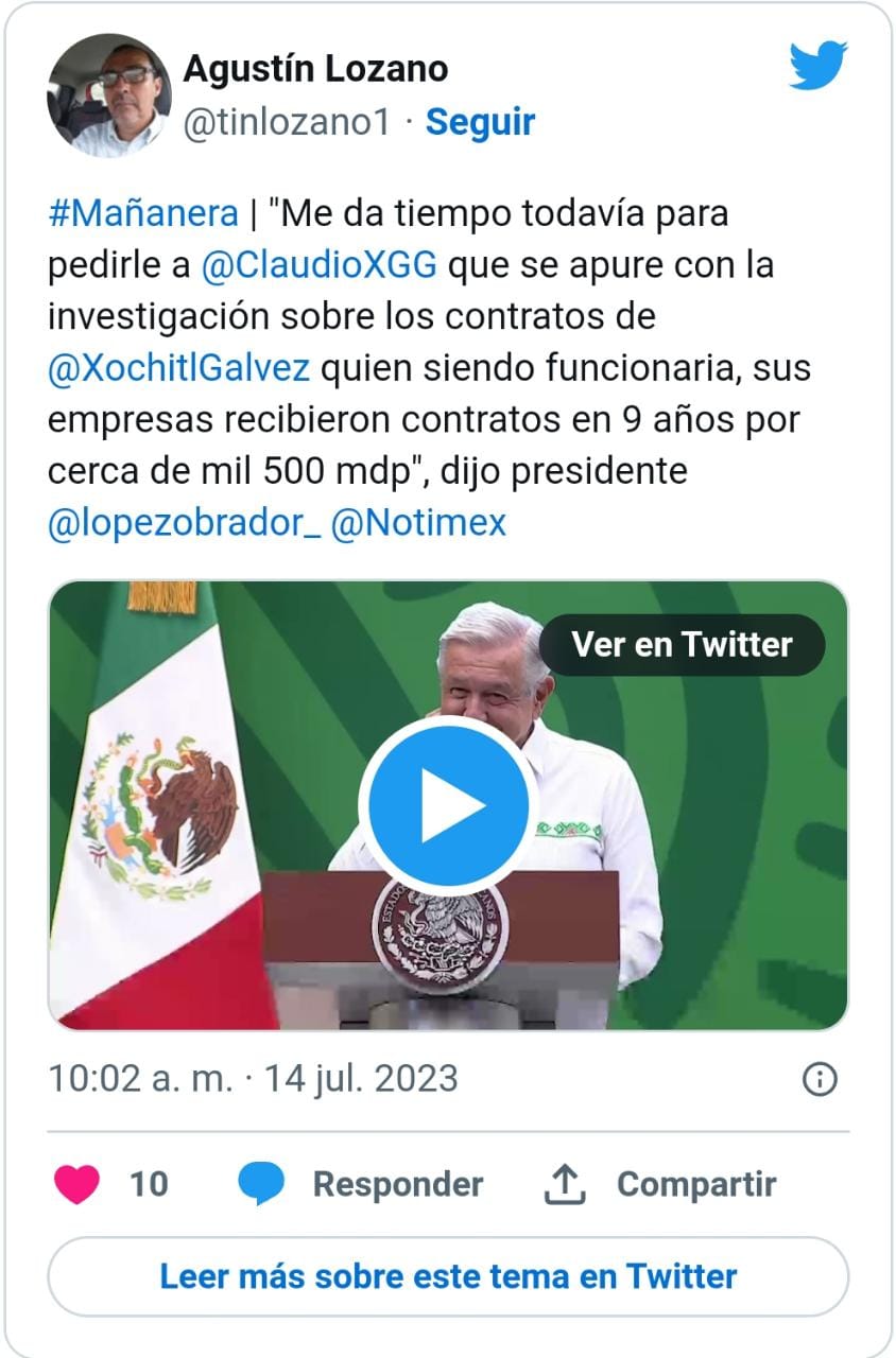 “Vamos a esperar a que Claudio X. González nos responda si van a hacer ellos la investigación. De todas maneras hoy a ver si le hacemos llegar a Claudio la información que tenemos. Si no hoy, el lunes, la que nos llegó de su protegida”, dijo López Obrador. Asegurando que le ayudará a sus investigadores, pues proporcionará mucha información sobre Gálvez.