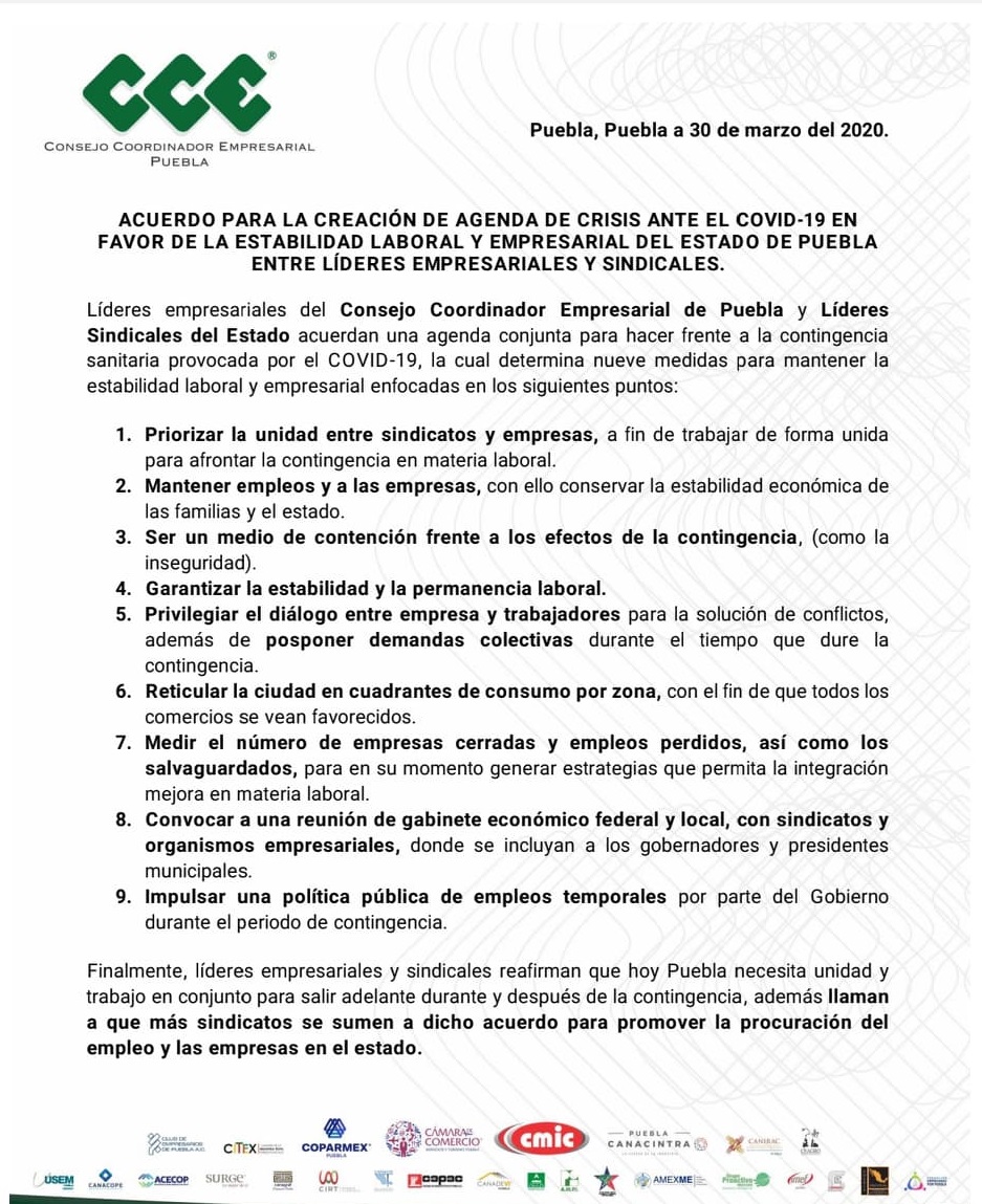 Entre otros puntos acordados están el mantener los empleos y a las empresas, para dar estabilidad económica a las familias, así como garantizar la estabilidad y permanencias laboral en Puebla.